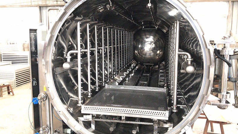 該設備由鍋體、鍋蓋、開啟裝置、鎖緊模塊、安全聯鎖裝置、軌道、滅菌框、蒸汽噴管及若干管口等組成、鍋蓋密封采用充氣式硅膠耐溫密封圈,密封可靠,使用壽命長。具有受熱面積大,熱效率高、加熱均勻、液料沸騰時間短、加熱溫度容易控制等特點、殺菌鍋主要用于食品行業、醫藥等各領域。